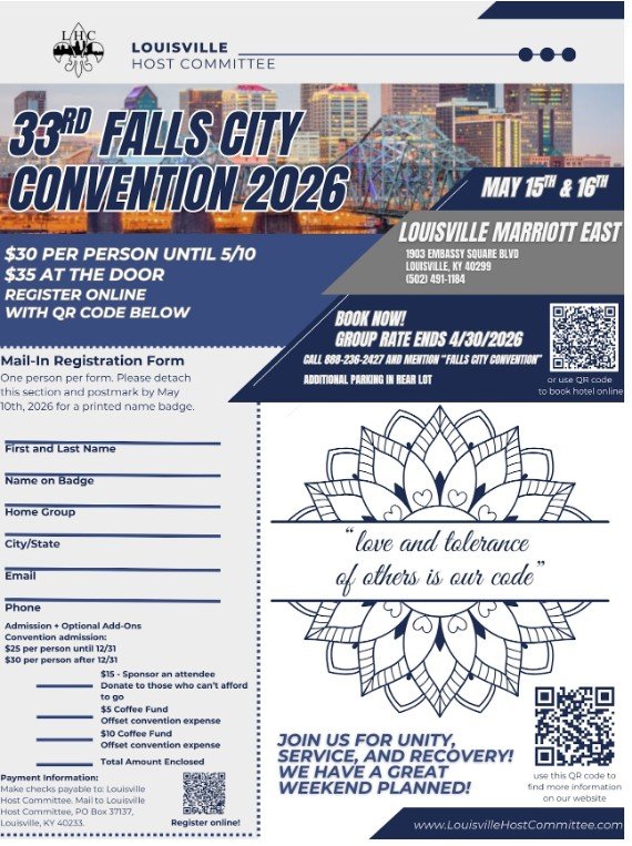 33rd Falls City Convention 2026 Louisville Marriott East. $25 Early Bird Price until 12/31/25. $30 per person until 5/10. $35 at the door. Register online at www.LouivilleHostCommittee.com. PRINTABLE FLIER BELOW.