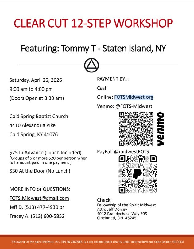 Clear Cut 12-Step Workshop, featuring Tommy T. - Staten Island, NY. Cold spring Baptist Church, 4410 Alexandria Pike, Cold Spring, KY. 9 am - 4 pm. $25 in advance (lunch included). $30 at door (no lunch). More information and registration at FOTSMidwest.org. PRINTABLE FLIER BELOW.