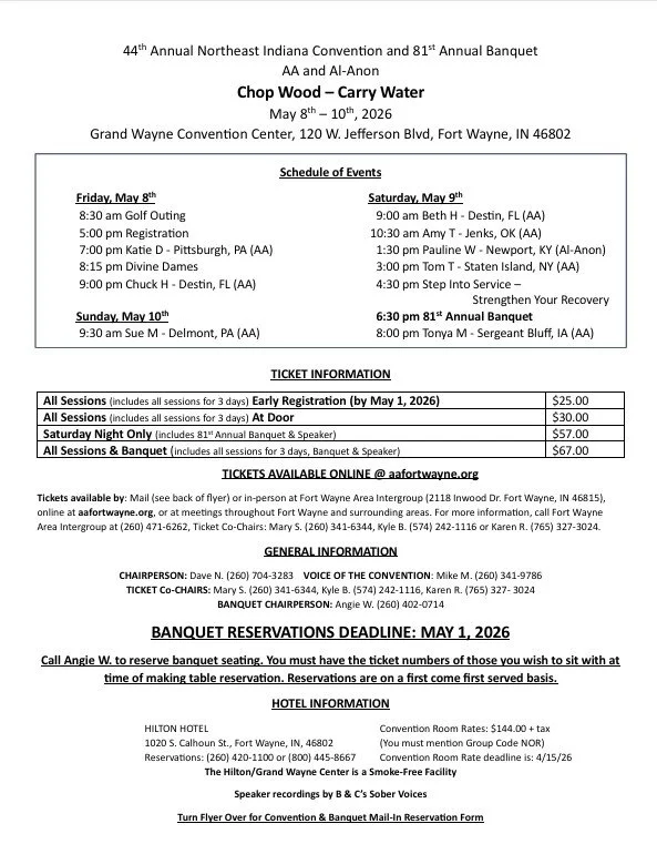 44th Annual Northeast Indiana Convention and 81st Annual Banquet. AA and Al-Anon. Grand Wayne Convention Center, 1120 W. Jefferson Blvd., Fort Wayne, IN. PRINTABLE FLIER BELOW.